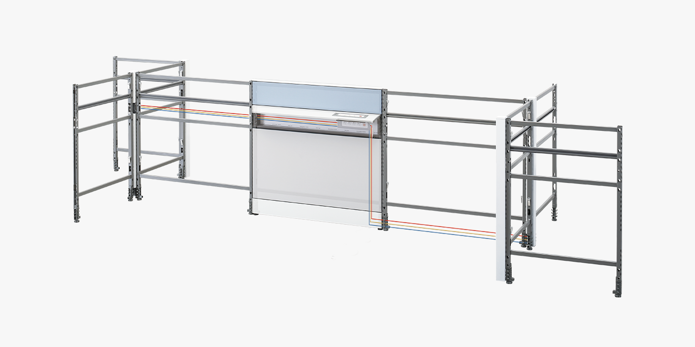 각종 브라켓을 걸어서 설치하는 행잉형 상판은 하부 동선에 걸림이 없어서 편리한 워크스테이션 구현이 용이하며 커넥트 된 다양한 스틸 브라켓 유닛은 규격화된 모듈로 원하는 홀에 걸어 다양한 레이아웃 구성이 가능합니다.